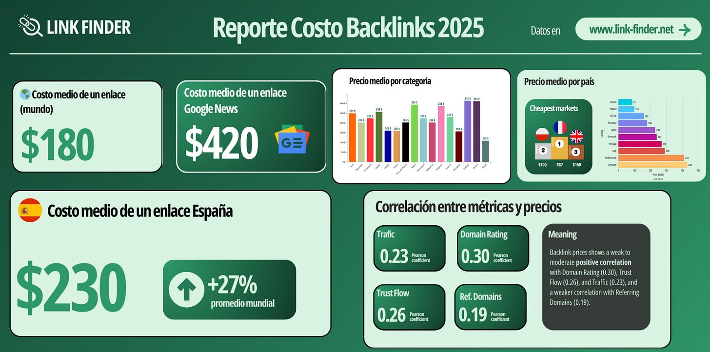 El estudio más completo de los precios de backlinks en España ha llegado de la mano de Link Finder, la herramienta que compara datos de +30 plataformas de link building en el mundo. Datos clave como el precio medio de un enlace en España, precios por categoría, comparaciones por métricas, correlaciones sobre los factores que afectan los precios de los links y mucho más. El estudio es accesible en este enlace.
