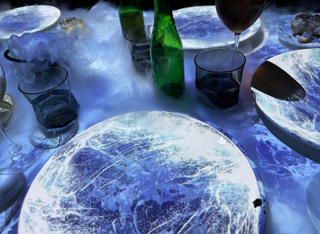 Lo mejor, sin duda, fue la mesa de proyecciones. Entre plato y plato, el entorno cambiaba con escenas relacionadas con lo que ibas a probar. Una de las más impresionantes fue cuando nos sirvieron la corvina: la mesa se transformó en el mar, con olas proyectadas y hasta humo para dar más realismo. Comer así es otra cosa, una mezcla de gastronomía y espectáculo que convierte la comida en recuerdo.