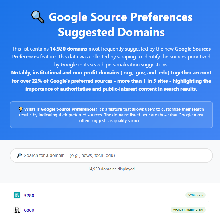 [Aplicación] Google Source Preferences Suggested Domains: Inmensa base de datos con casi 15.000 dominios preferentes para Google. Un recurso imprescindible para el marketing digital y la estrategia de contenidos dado que a través de este análisis podemos entender cómo Google evalúa la calidad.