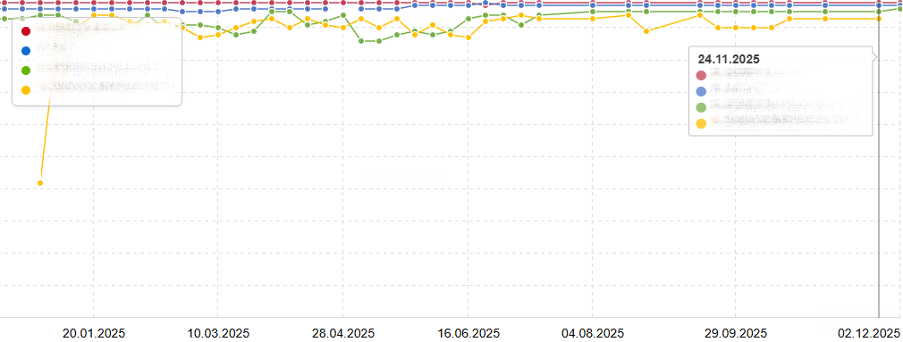 Os comparto el caso de esta semana. Mi cliente es la línea amarilla. Después de una magnífico año donde nos hemos pegado con los grandes competidores y habíamos logrado estabilizarnos en el TOP10, la semana pasada desaparecimos.