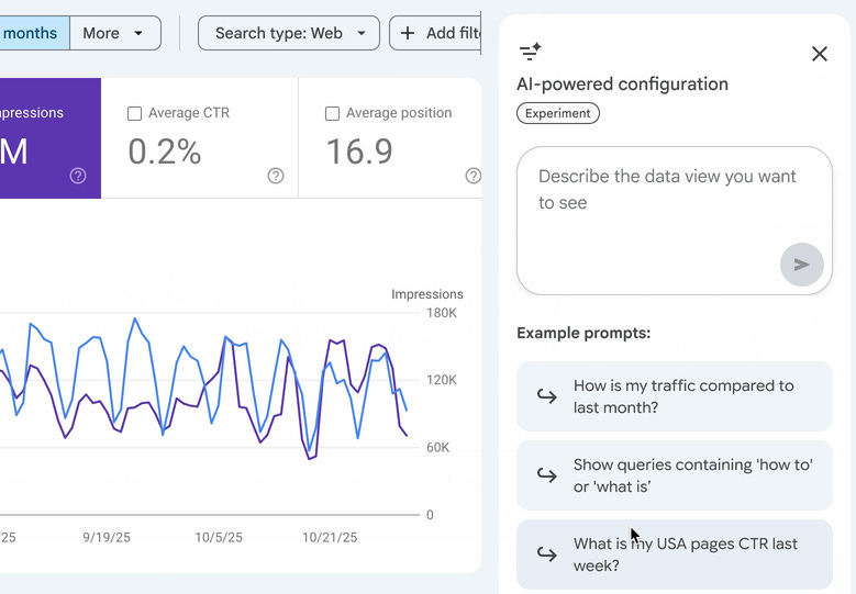 Google prueba la configuración con IA en Search Console. Ha lanzado una función experimental en el informe de Rendimiento que utiliza IA para simplificar la selección, filtrado y comparación de los datos, lo que nos facilita y agiliza los análisis. También hay novedades con los filtros, permitiendo agrupar por días festivos, semanas o meses.