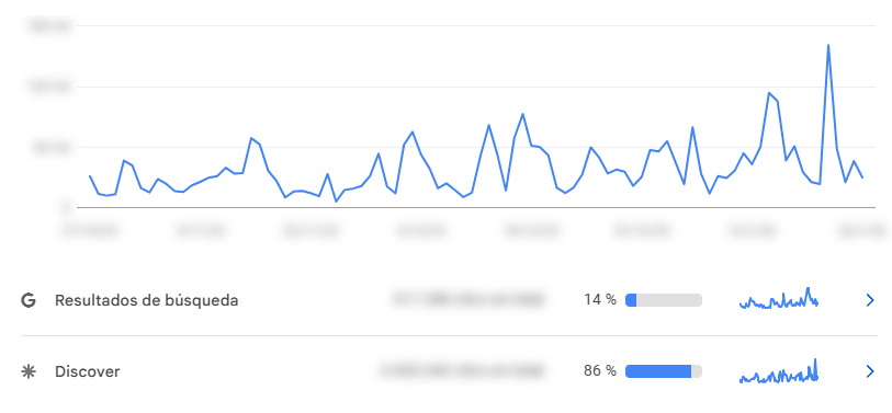 Gráfica de GSC que muestra el 14% de Búsqueda y 86% de Discover. Ambos crecientes.