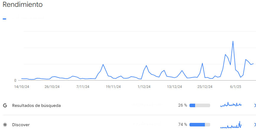 Como muestra la siguiente gráfica de GSC, el tráfico se ha estabilizado con un balance positivo: un 14% proveniente de búsqueda orgánica (crecimiento sólido a largo plazo) y un 86% de Discover, que ha vuelto a dispararse de forma natural gracias a que ahora Google confía de nuevo en la autoridad y frescura de nuestros contenidos.