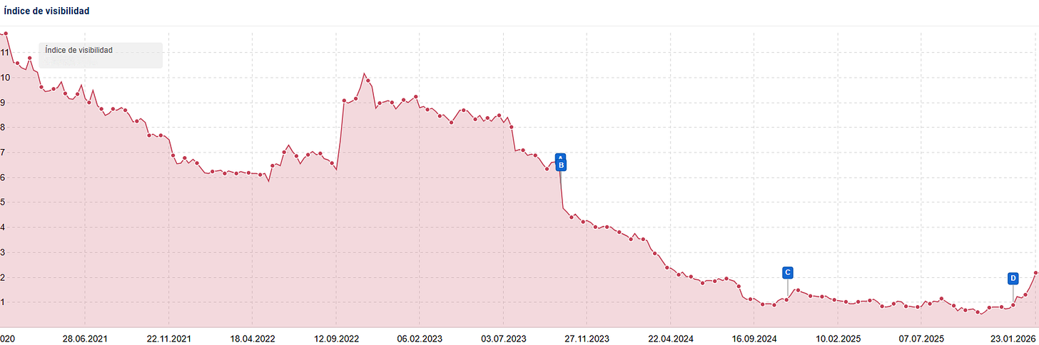 Cuando iniciamos este proyecto, nos encontramos con un medio que, aunque no tenía una penalización manual explícita, sufría una caída constante en su índice de visibilidad desde hacía varios años. Por supuesto, el tráfico en ese momento era una ínfima fracción de lo que llegaron a tener años atrás.