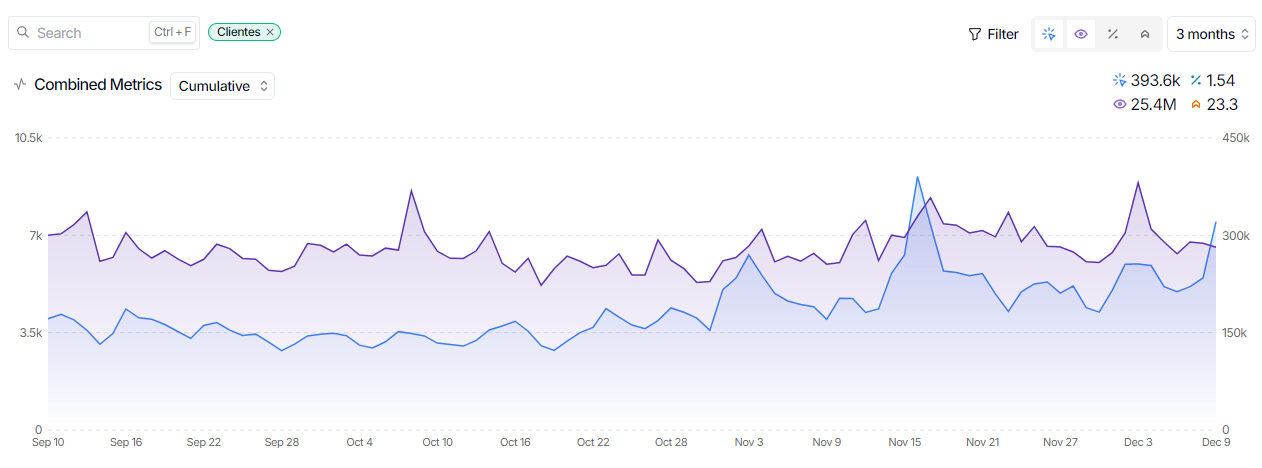 SEO Gets: Mira que soy poco de este tipo de herramientas pero confieso que esta me ha enamorado porque hace algo que, hasta ahora, hacía yo manualmente: ofrecerme un panel de control para todas las páginas que tengo en Google Search Console. Esto facilita enormemente mi trabajo, dado que de un simple vistazo puedo ver rápidamente la evolución de todos los proyectos SEO. Para más beneficio, puedo agrupar los perfiles de GSC con etiquetas. Por ejemplo, en esta etiqueta de clientes, tengo tres proyectos nuevos en los que apenas llevo trabajando unos meses. Además de ver cada uno, incluso puedo ver el acumulado de todos ellos. En proyectos en los que tengo 1, 15 o incluso 20 perfiles, es un dato muy interesante.