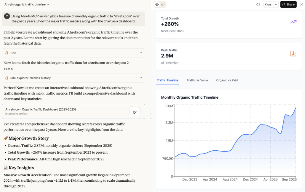 Con este lanzamiento de MCP, Ahrefs propone un cambio de paradigma: conectar modelos como ChatGPT o Claude directamente a su base de datos. Es decir, hacer que la IA interprete los datos en lugar de que el analista los recopile manualmente.