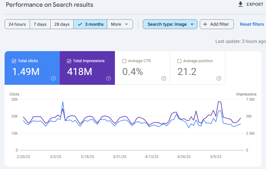 No son pocas las ocasiones en las que he visto que se ha despreciado la importancia de las imágenes, tras una migración o relegando las acciones SEO para mejorar su posicionamiento al final de la lista. La realidad es que, si cumples uno de los dos criterios antes expuestos, el tráfico de imágenes puede ser un canal relevante para tu sitio. Os dejo un ejemplo de un sitio con una media de 10k clics diarios con imágenes.