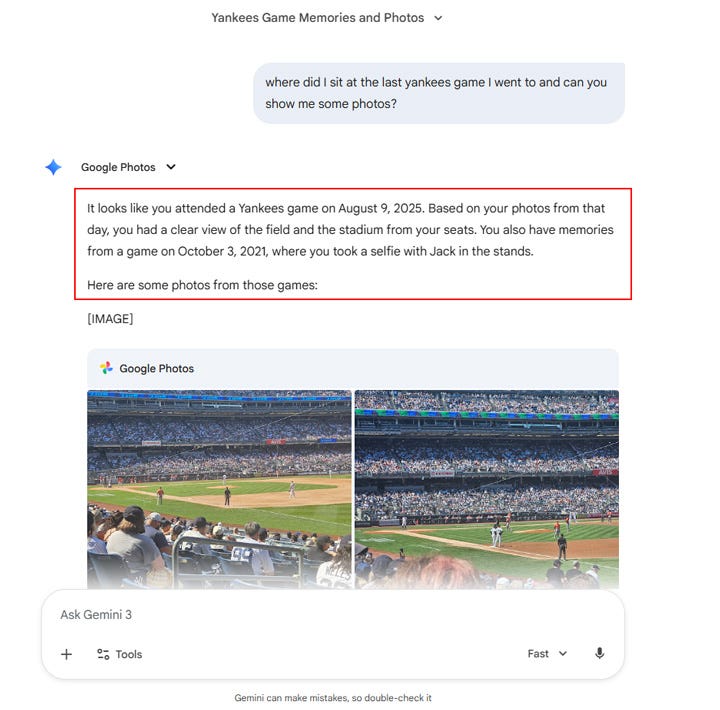 La IA puede acceder, si el usuario lo permite, a datos de Gmail, Google Fotos, YouTube, Maps o el historial de búsqueda. Eso le permite responder con un nivel de contexto nunca visto: recordar compras pasadas, identificar lugares visitados a partir de fotos, sugerir contenidos de creadores que ya sigues o adaptar recomendaciones a tus hábitos reales. Esta es una de las imágenes que Glenn ha compartido en su publicación donde le pregunta a la IA dónde se sentó en el último partido de los Yankees que fue a ver.