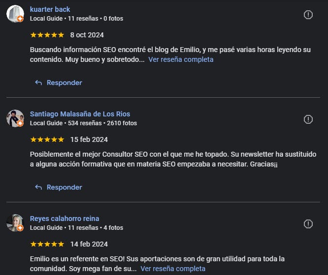 Algo parecido ocurre con los Local Guides. Google confía más en usuarios que participan activamente en su ecosistema. No es una cuestión de justicia, sino de fiabilidad algorítmica. Aunque aquí también tengo mis dudas de que esa característica no se esté usando para “forzar” a los usuarios a interactuar con su sistemas más y más. Yo lo haría y seguro que ellos también. Y lo mismo sucede con las fotos: una reseña con imagen es más verificable, más tangible, más “real”.