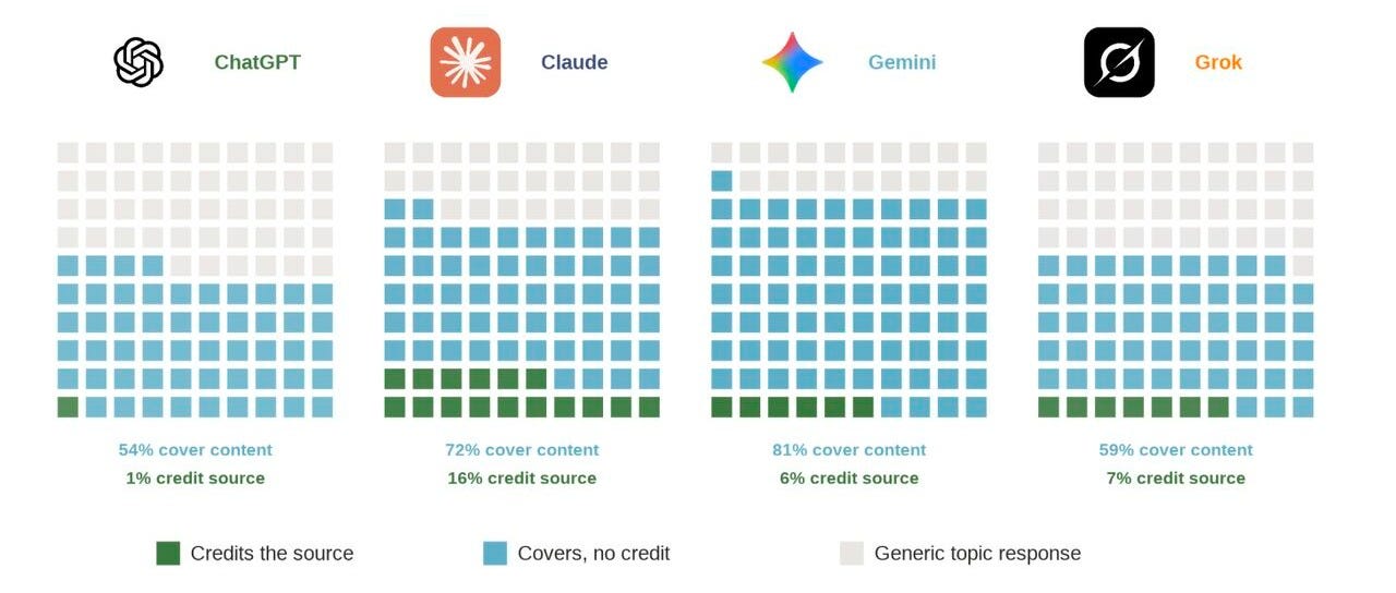 ChatGPT, Gemini o Claude no citan a los medios que usan en sus respuestas: en el 92% de los casos no citan fuentes y, cuando lo hacen, es difícil que el usuario pinche en la noticia original. No es un fallo técnico, sino una decisión de diseño, ya que si se las obliga a citar, lo hacen casi a la perfección. Ni siquiera los muros de pago las frenan, pues tiran de redes sociales para ofrecer respuestas sin dar crédito a sus autores. Se nos está quedando un panorama muy bonito.