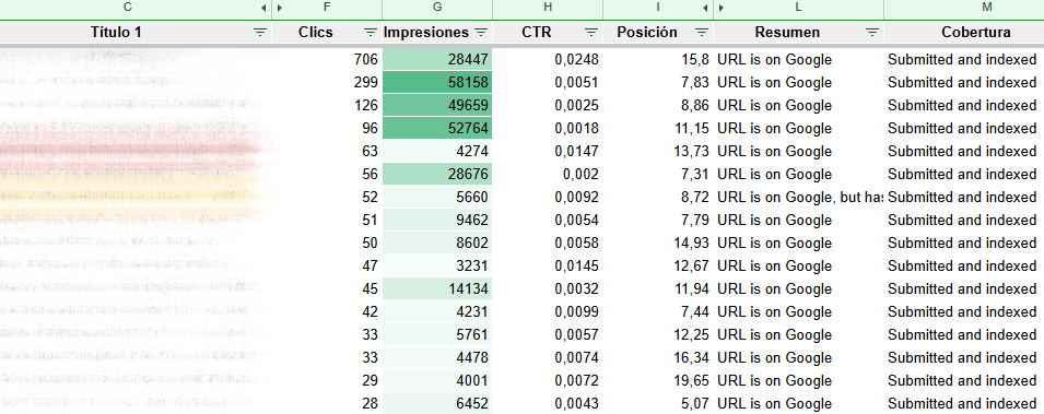 Cuando trabajas con cientos o miles de URLs, este enfoque cambia las reglas del juego. Ya no analizas casos aislados, sino comportamientos. Empiezas a ver qué tipo de páginas se indexan peor, dónde se atasca Google, o qué plantillas generan más fricción al rastreo. Os dejo un ejemplo del export de ScreamingFrog que he realizado a un cliente donde podemos ver enfrentados los datos de captación (Clics e Impresiones) junto con el estado de indexación de Google.